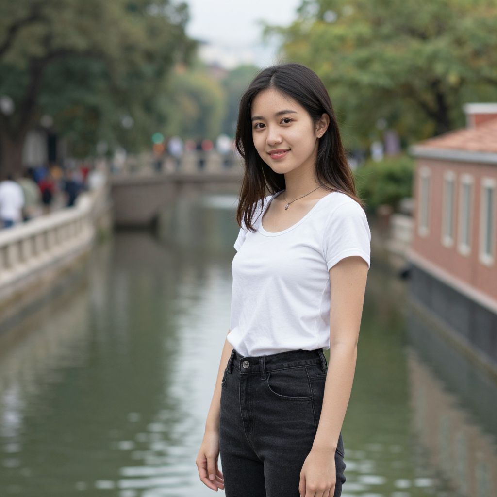 Photograph of an Asian teenage girl with straight black hair, standing by a canal. She wears a white short-sleeved shirt and black high-waisted jeans. She has a light skin tone and a subtle smile. In the background, there's a canal with reflective water, lined with trees and a red brick building on the right. A white railing runs along the left side, and blurred figures of people are visible in the distance. The image has a slightly soft focus, emphasizing the girl in the foreground.