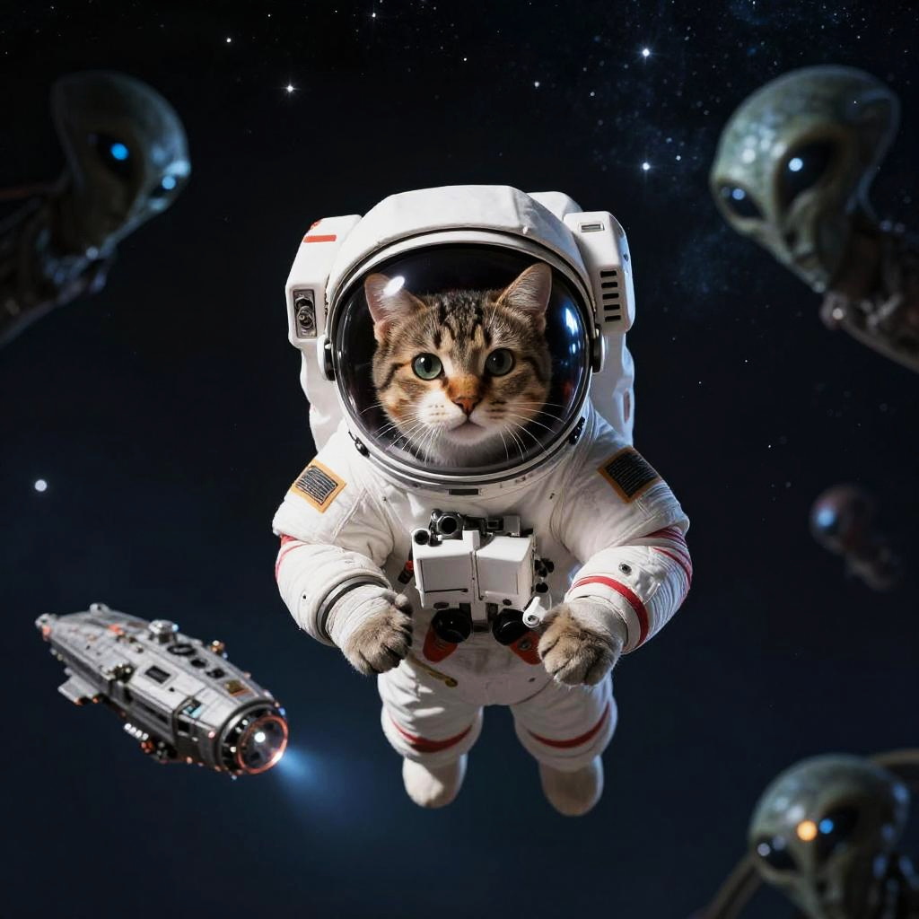 Photorealistic image of a tabby cat wearing a full astronaut suit and helmet floating in outer space. The background features a starry night sky with distant galaxies. Surrounding the cat are several extraterrestrial aliens and a detailed alien spaceship emitting light. The scene captures dramatic lighting and high-resolution details, highlighting the cat's expressive face inside the helmet as it looks directly at the viewer.