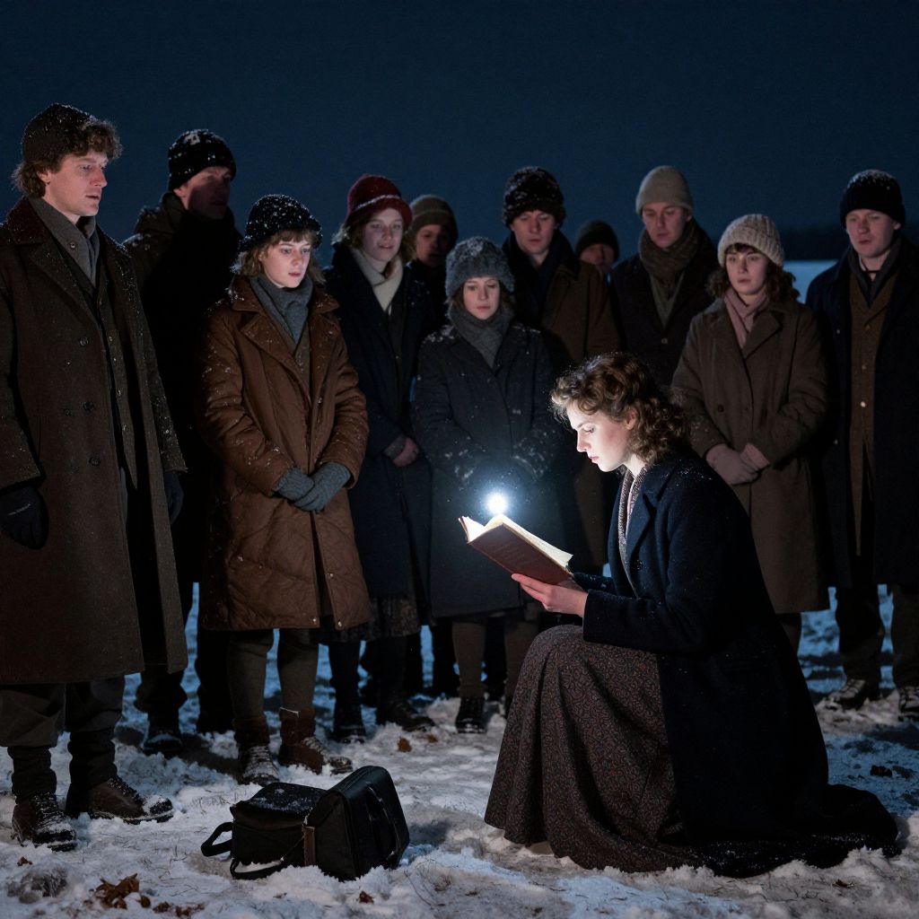 Photograph of a nighttime outdoor winter gathering. A woman with curly hair, dressed in a black coat and brown skirt, sits on snow-covered ground, reading a book illuminated by a bright flashlight. She is surrounded by a group of 11 people, mostly men, wearing dark winter coats, hats, and gloves. Their expressions are focused and calm. A black bag rests on the snow near the seated woman. The background is a dark, starless night sky, adding to the cold, quiet atmosphere. The overall mood is somber and reflective.