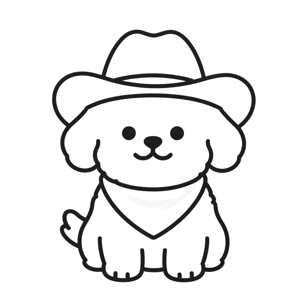 Pastel line art of a cartoon llama wearing a cowboy hat and bandana around the neck, whimsical and charming style