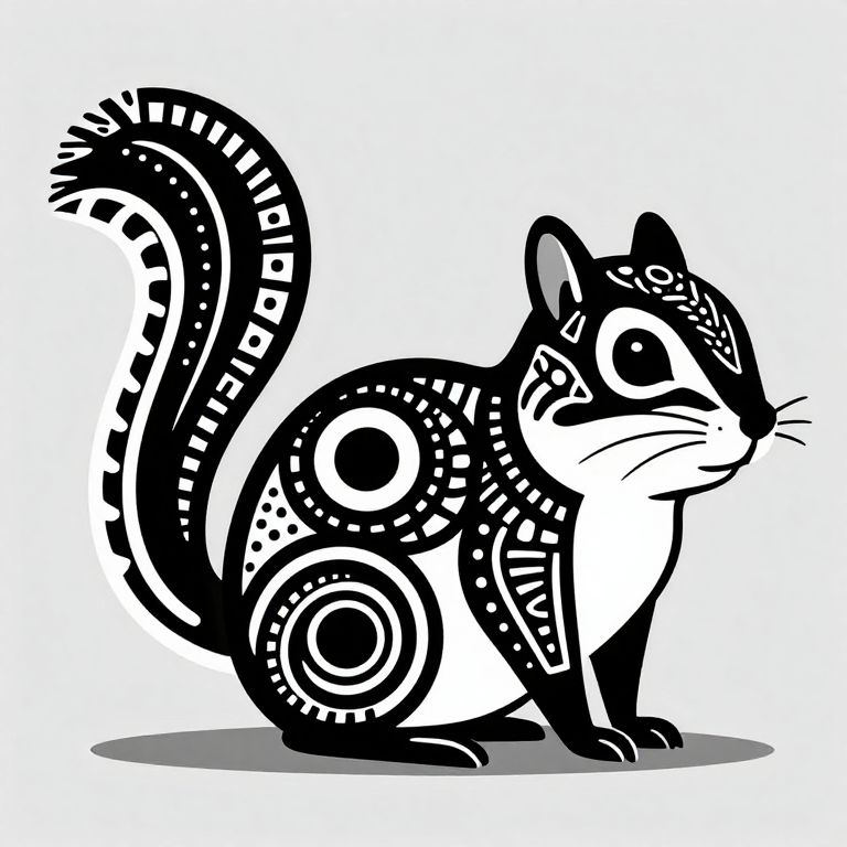 The image depicts a stylized black and white chipmunk, rendered in a minimalist, abstract art style reminiscent of Adinkra patterns. The chipmunk's body is composed of geometric shapes, primarily circles and ovals, with intricate patterns and textures that give it a three-dimensional appearance. The tail is elongated and features a striped pattern, adding a dynamic element to the composition. The chipmunk's face is characterized by large, expressive eyes and a small, rounded nose, giving it a friendly and approachable demeanor. The overall arrangement of the shapes and patterns creates a harmonious balance, with the chipmunk's body and tail forming a cohesive unit against a neutral gray background. The use of black and white enhances the contrast and highlights the intricate details of the patterns, making the image visually striking and engaging.