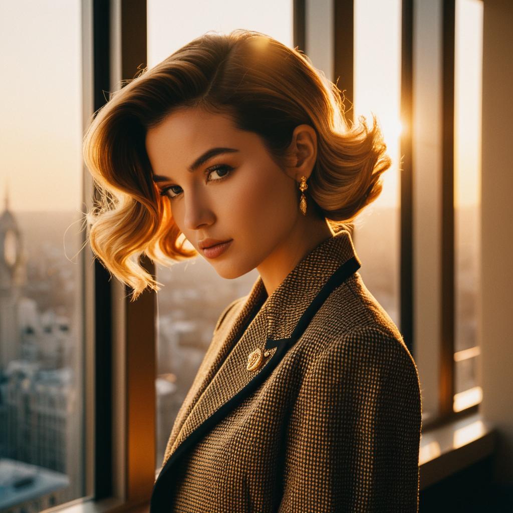 Portrait of a caucasian woman with a vintage comb over hairstyle wearing a classic checkered blazer with black trim and gold earrings, standing in a luxury penthouse during golden hour. The warm sunlight enhances the elegance and sophisticated fashion editorial vibe.
