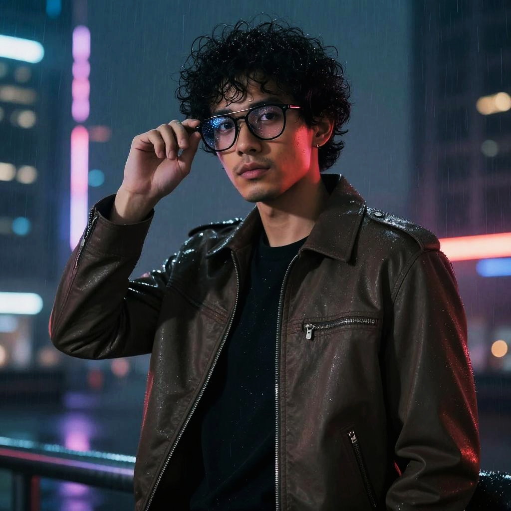 Curly hair with glasses male, futuristic cyberpunk cityscape, neon lights reflecting on the lenses, stylish jacket, confident pose, intense gaze, rainy night