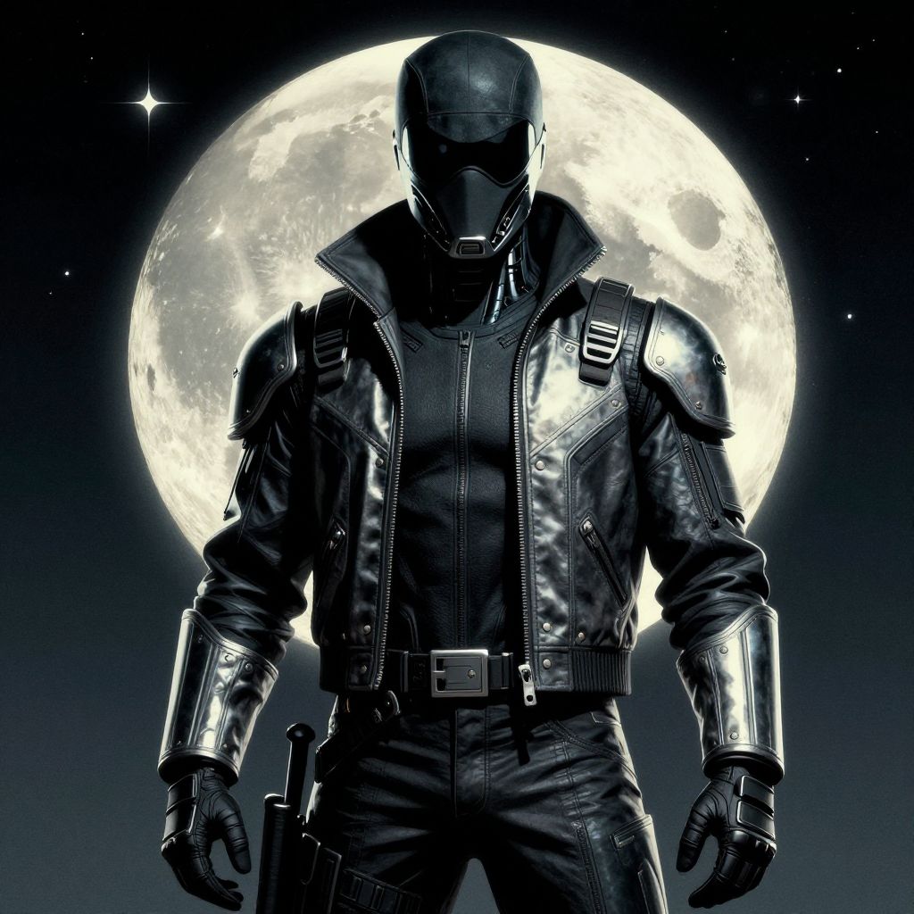 This digital illustration features a silhouette of a muscular, armored figure standing in front of a luminous full moon. The figure wears a black, glossy leather jacket with metallic shoulder pads, a high collar, and matching pants. His face is obscured by a black helmet with a reflective visor. He has armored gloves and a utility belt. A handgun is holstered at his right hip. The background is a starry night sky, emphasizing the glowing moon's bright, white light. The overall color scheme is dominated by blacks and whites, creating a stark, dramatic contrast.