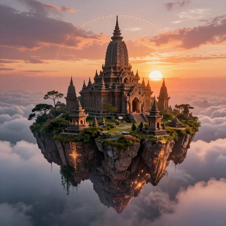 Digital fantasy artwork of a floating, detailed Buddhist temple at sunset, surrounded by clouds, with a reflective water surface below.