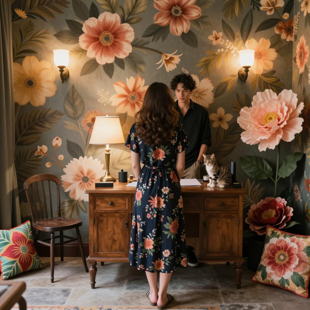 A woman in a floral dress stands in a room with large flower-patterned wallpaper. A man in a black shirt stands behind her. They face a wooden desk with a lamp and objects. A dark wooden chair is to the left. The floor is stone, and a colorful pillow is on a nearby surface. Two large floral decorations are on the right. A cat is on the desk. Two wall-mounted lights illuminate the scene.