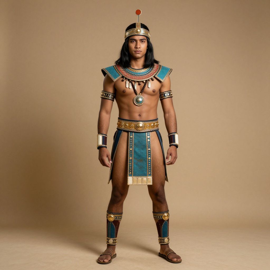 Photograph of a young, muscular man of likely Egyptian descent, standing against a plain beige background. He has long black hair and a serious expression. He is wearing traditional ancient Egyptian attire: a blue and gold striped loincloth, gold and turquoise armlets, a large turquoise and gold necklace, and a headpiece with a red top. His bare chest reveals a fit physique. He also wears brown sandals with gold accents. The background is simple, focusing attention on his detailed, colorful costume, which includes intricate patterns and metallic elements.