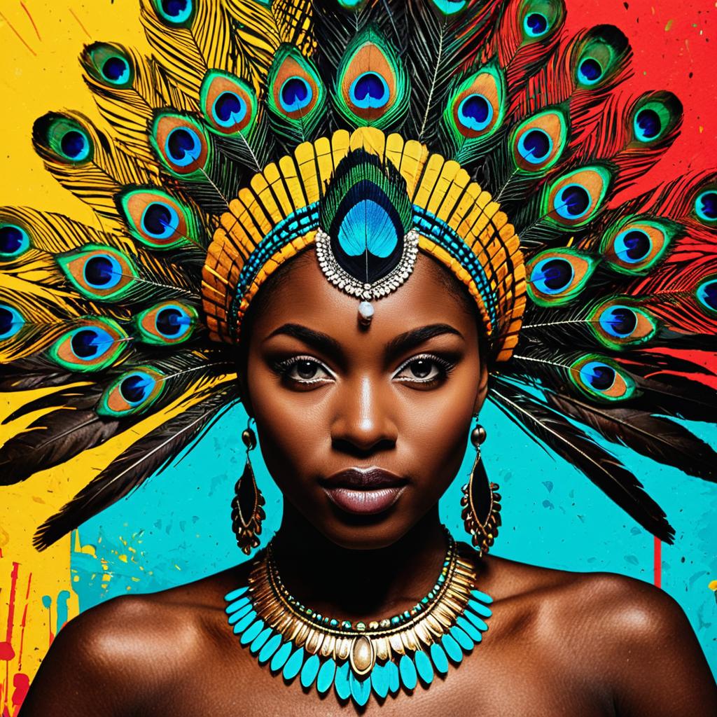 Pop art style, an Amazon rainforest shaman with a parrot feather crown against a psychedelic color swirls.