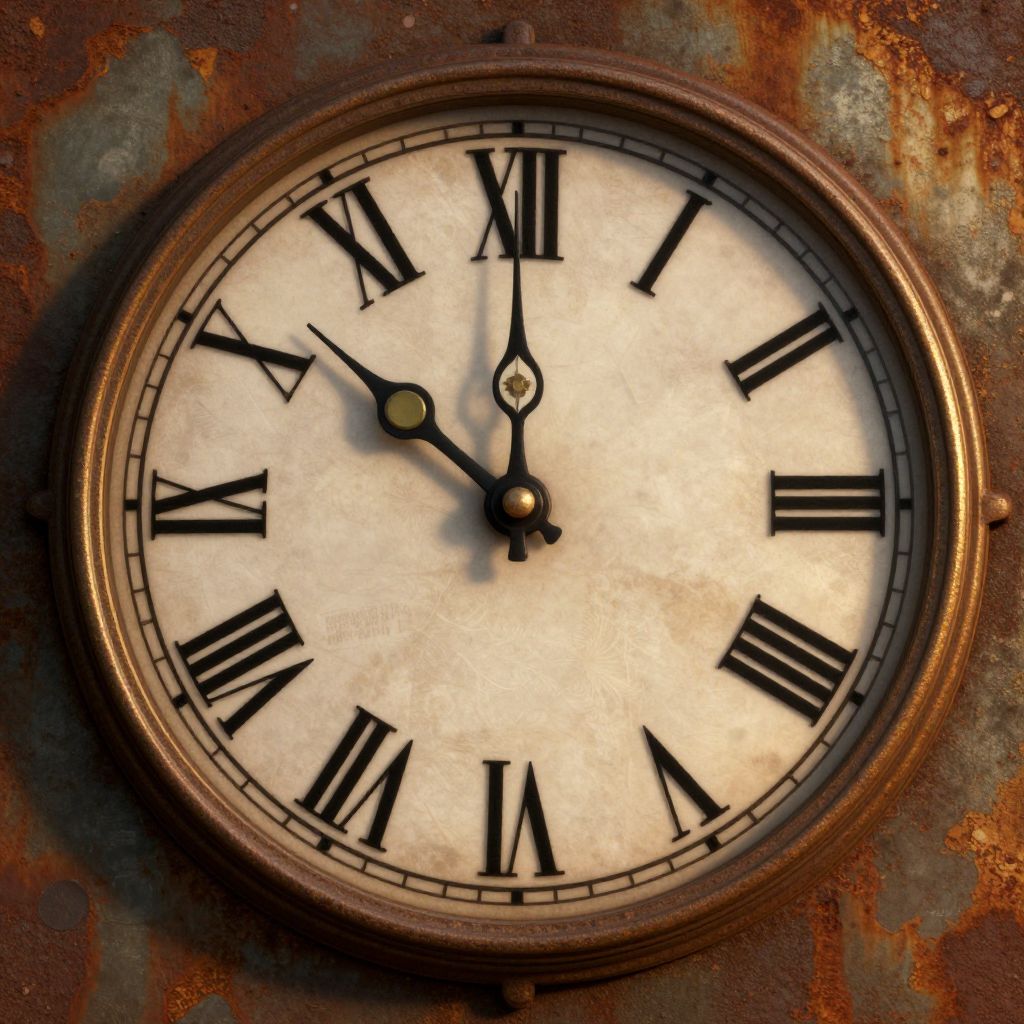 Vintage, weathered clock with Roman numerals, black hands, and an ornate gold frame, set against a rusted, textured background.