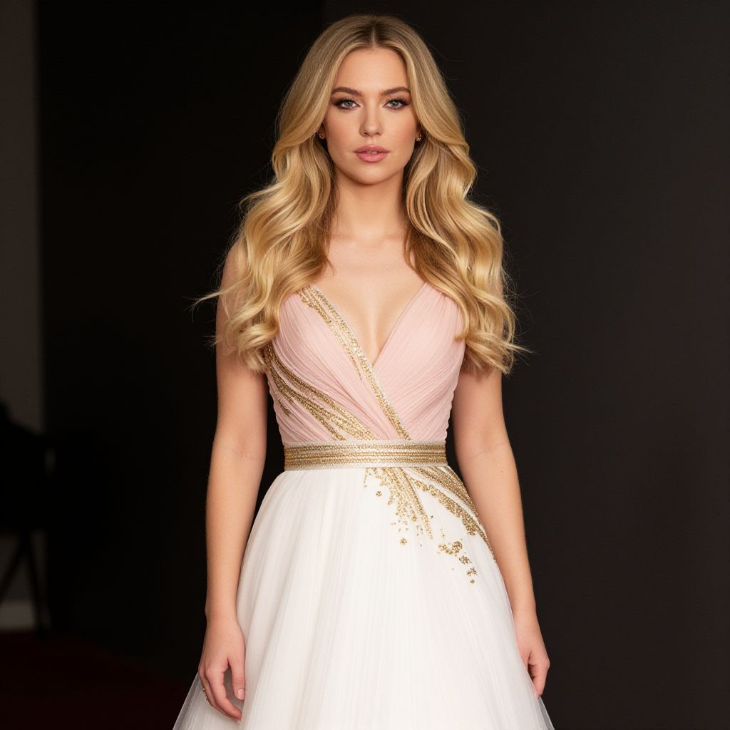 A confident blonde woman poses elegantly in a vibrant orange dress with a fitted bodice and a flared skirt. She accessorizes with ornate gold jewelry, including a statement necklace, earrings, a decorative belt with a blue centerpiece, and matching bracelets, set against a softly blurred architectural background.