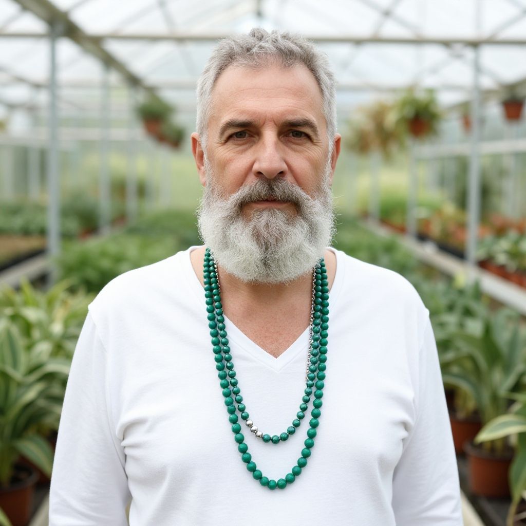 Portrait of a mature man with a full white beard and short grey hair standing inside a greenhouse filled with potted plants. He wears a white V-neck shirt and layered green beaded and silver necklaces. The background shows rows of green plants and greenhouse structure.