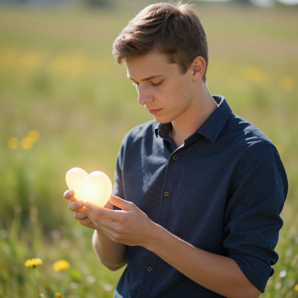 A photograph of a young man with short brown hair and a fair complexion, wearing a dark blue shirt, standing in a sunlit grassy field. He's holding a glowing, heart-shaped object with both hands, looking down at it with a calm expression. The background is softly blurred with greenery and yellow wildflowers, bathed in warm sunlight.