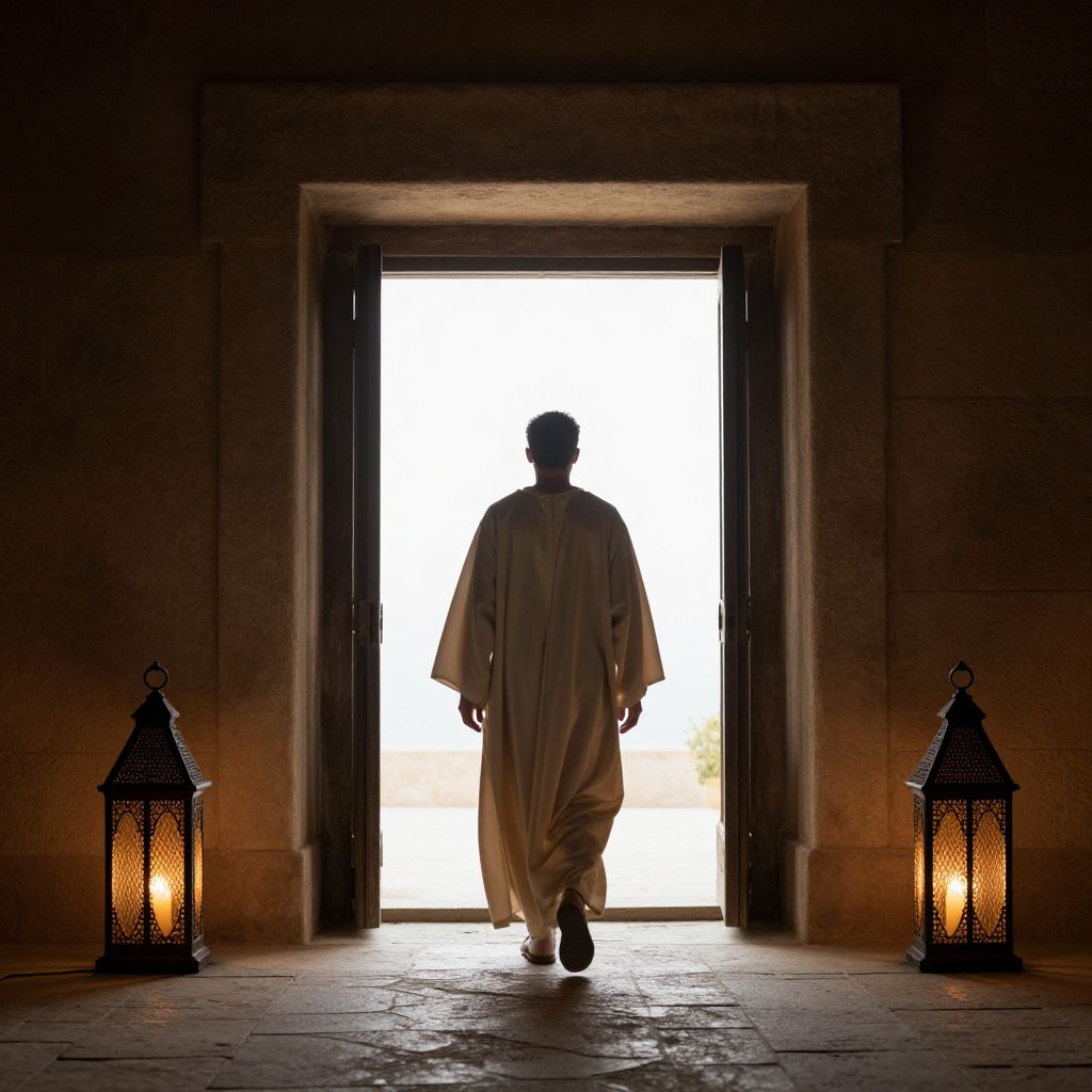 A man in a robe walks through a doorway illuminated by a bright light, leading to a path with lanterns on either side.