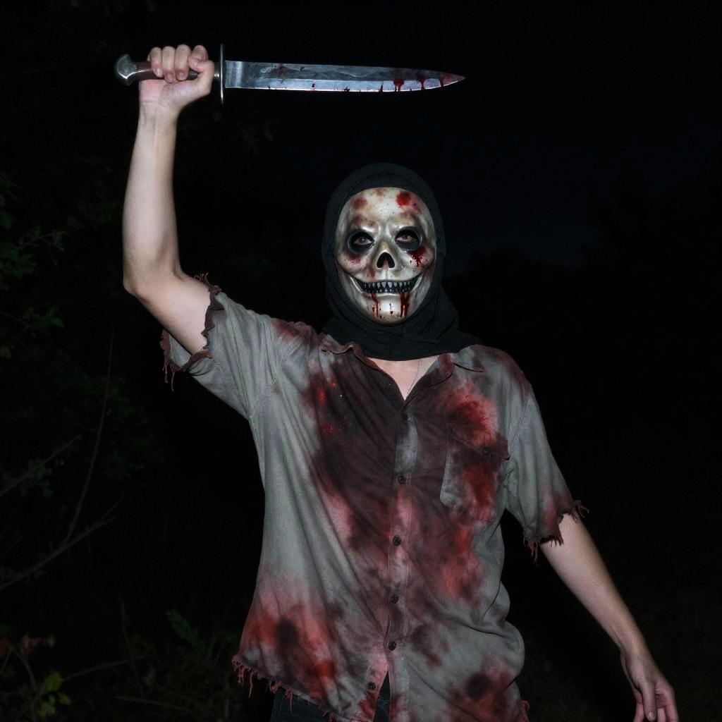 Photograph of a tall, menacing figure wearing a blood-stained, tattered shirt, and a horror mask with eye holes and a grimace. The figure holds a bloodied knife in the right hand, raised high. Dark forest background. Outstretched left hand. Black night sky. Horror theme.
