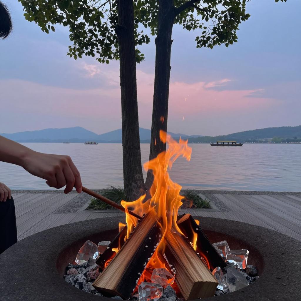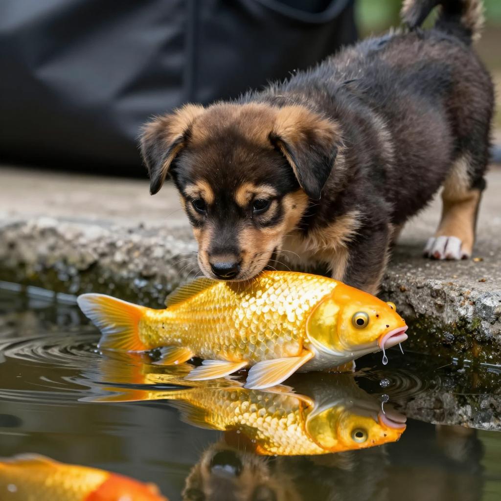 Man in white outfit, pink hat, and pink belt stands on canal boat, throwing fishing rod at jumping fish. Left side has basket, bread, and red flowers on table. Green water, bridge in background. Daytime, outdoor scene.
