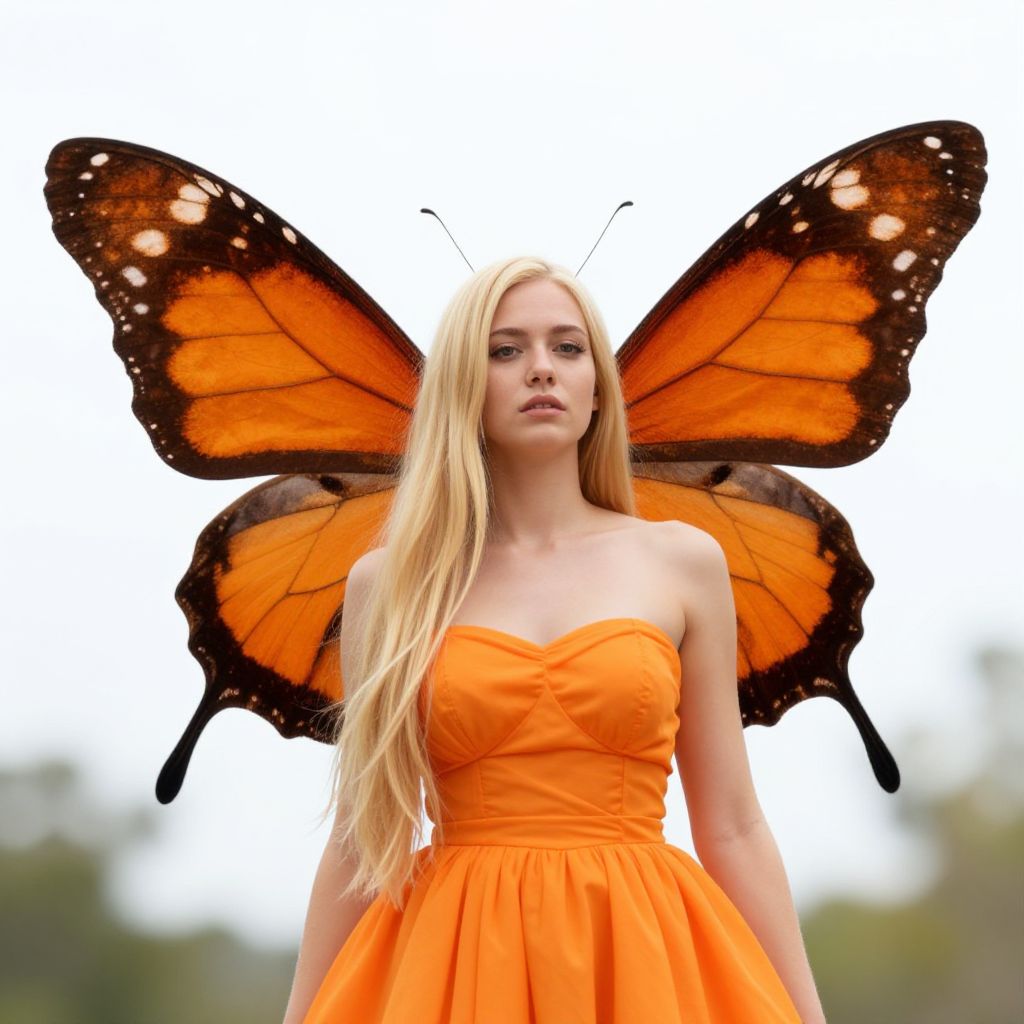 Orange monarch butterfly, 1girl, wings, solo, insect wings, blonde hair, antennae, dress, butterfly wings, long hair, bare shoulders, strapless, orange dress, outdoors, fairy, strapless dress
