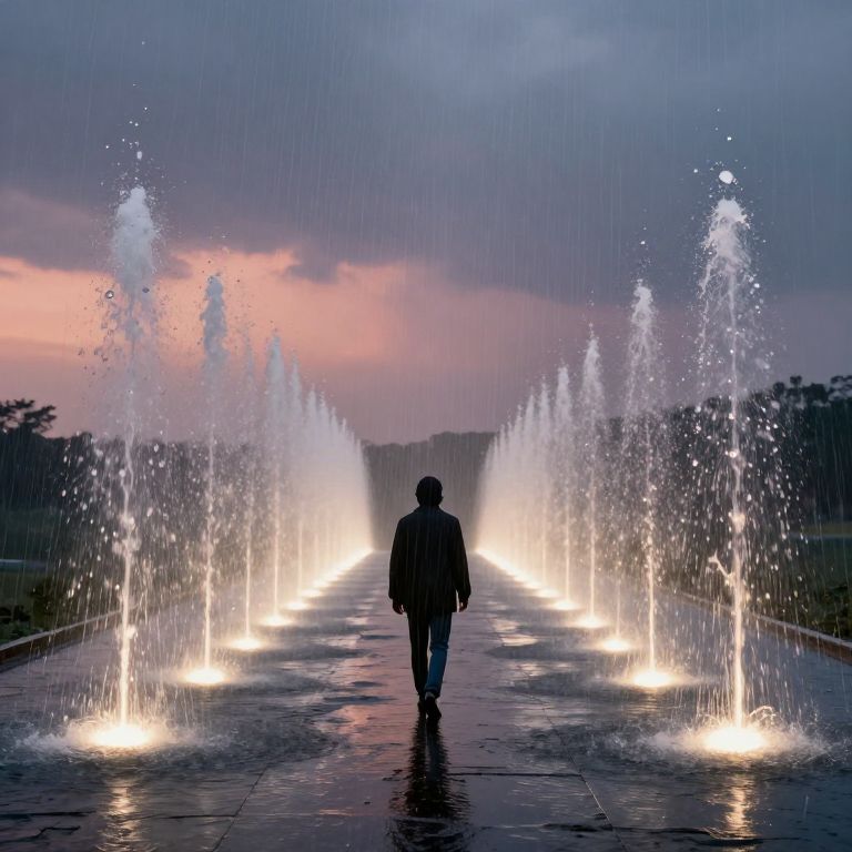 Photograph of a lone silhouette, a man in dark clothing, walking down a wet, reflective pathway lined with bright, illuminated fountains. The pathway leads to a glowing, distant light, with water spraying high from both sides. The sky above is dramatic, with dark clouds and a pinkish-orange sunset. The scene is serene yet powerful, with the contrast between the dark figure and the bright fountains. Trees are visible in the distance on either side.