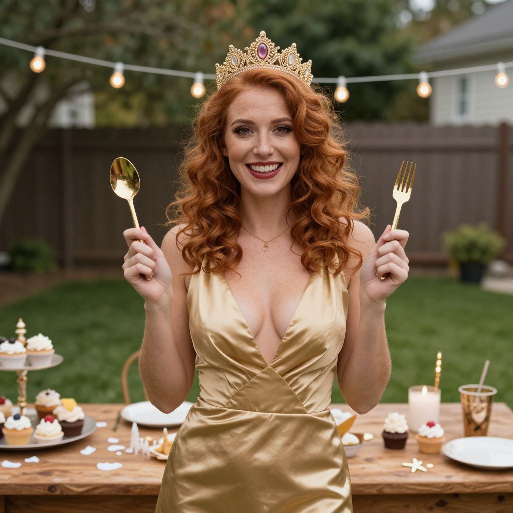 A photo of a smiling red-haired woman with curly hair wearing a gold crown and a low-cut, gold satin dress with a deep neckline. She holds a golden spoon and fork in each hand. She's standing in a backyard with string lights, green grass, and a wooden table covered with cupcakes and candles. The background shows a blurred fence and trees.