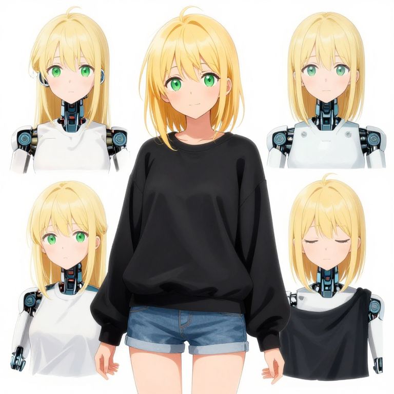 "Humanoid Robots blonde girl with green eyes. she has a black sweatshirt and denim shorts. Different emotions on the face. anime sprite. Drawing in the style of Kimi no Na wa,"