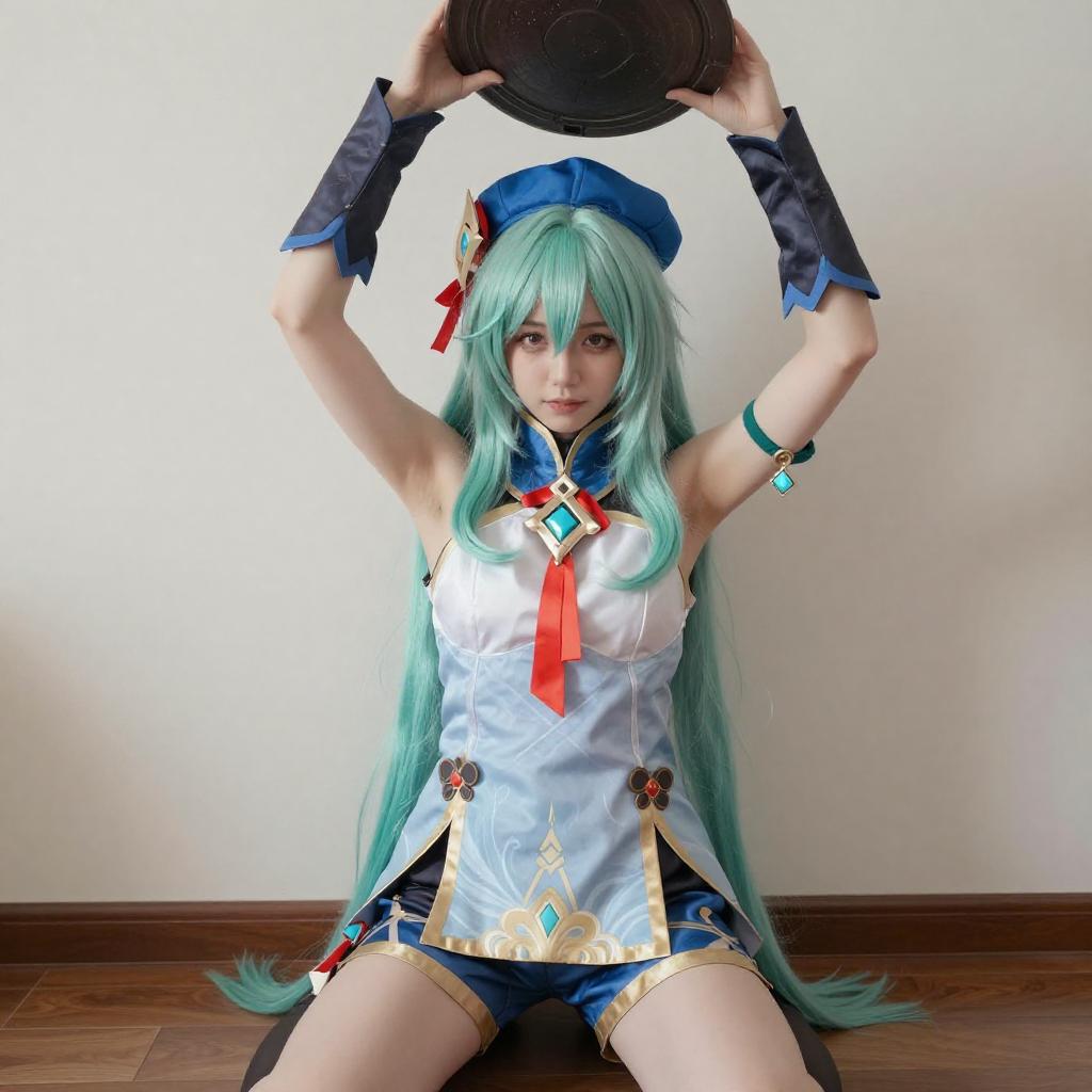 Photograph of a person with long, mint-green hair, wearing a blue and white cosplay outfit with a blue hat, red ribbon, and ornate pendant. They are kneeling on a wooden floor, arms raised and hands gripping a dark, circular object above their head. The background is a plain, light-colored wall.