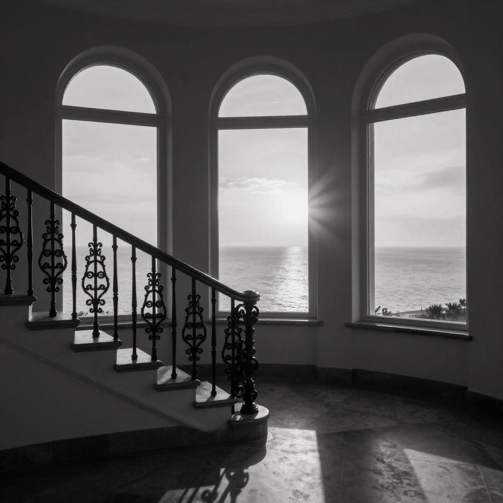 Black and white image of a curved staircase with ornate railing casting shadows on the floor, framed by arched windows overlooking a calm ocean with the sun setting on the horizon. The architectural elements contrast with the natural seascape, creating a dramatic interplay of light and shadow.