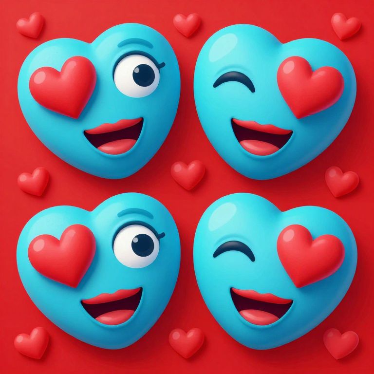 A vibrant digital artwork featuring heart-shaped faces with turquoise blue skin, bold red hearts as lips, and expressive eyes, set against a vivid red background adorned with scattered heart motifs, evoking a whimsical and romantic Valentine's theme.