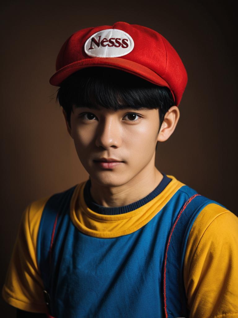 Man cosplay. Wearing Ness costume. Realistic photo. Dressed as Ness --sref 1389