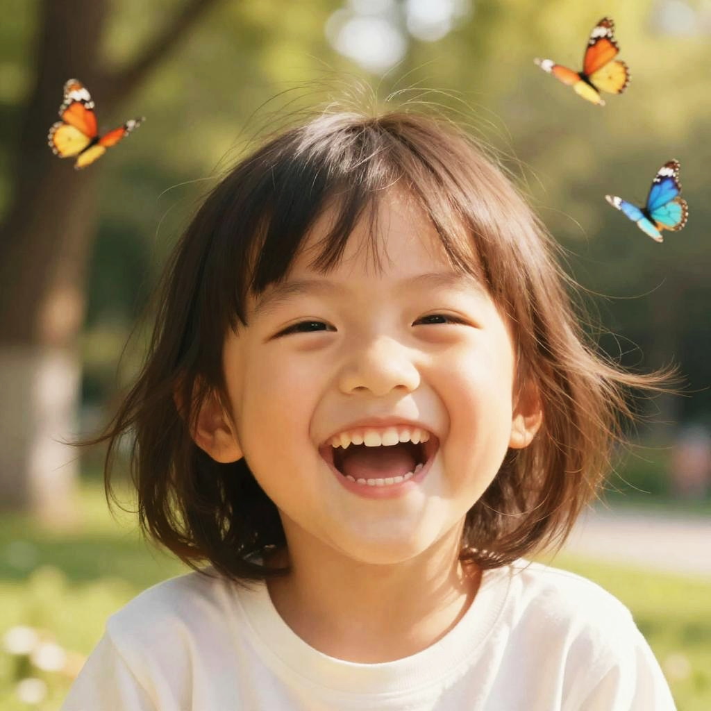 Smile on face, close-up of a child laughing with pure happiness, sunlit park setting with blurred trees and colorful butterflies, gentle breeze moving strands of hair, high-detail digital painting capturing innocence and joy.