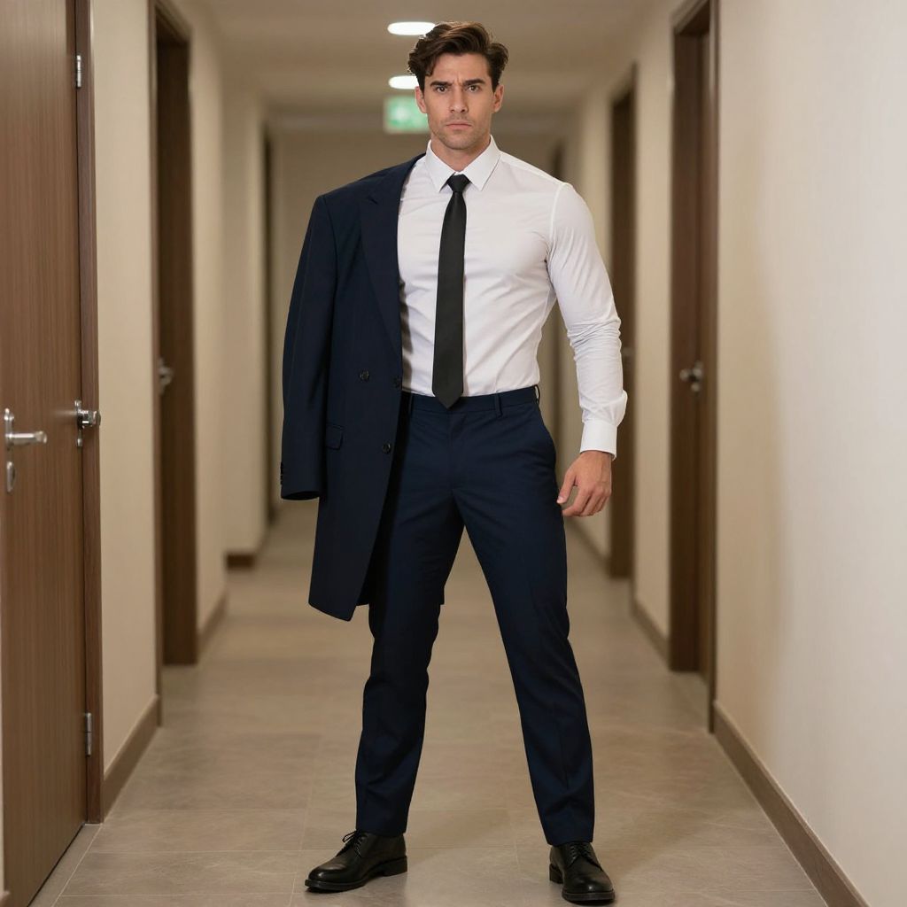 Man Muscle Suit Costume, a man in a suit standing in a hallway with a coat on