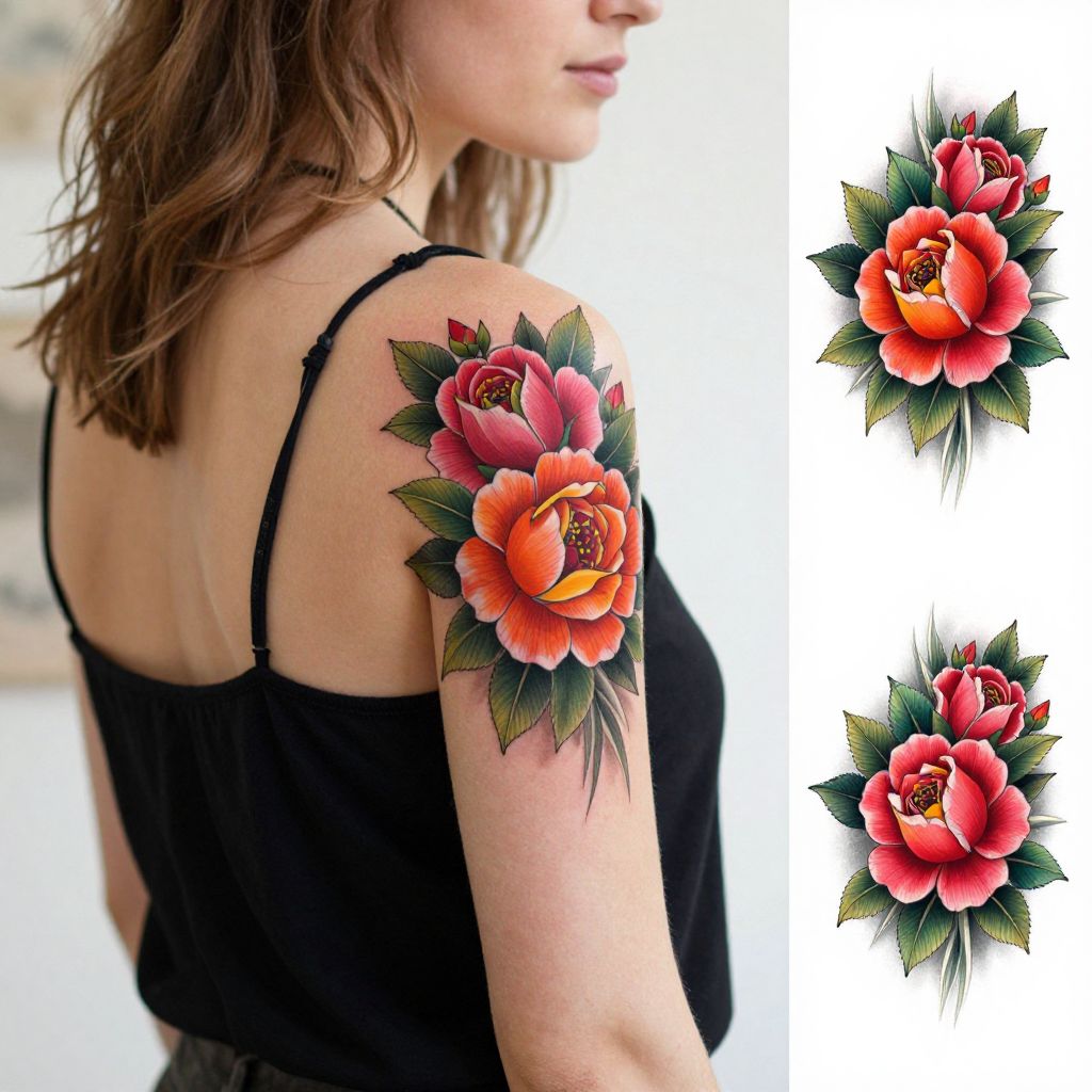 Photograph of a woman with light brown hair, shown from the back and side, wearing a black spaghetti strap top. Her left arm and upper back feature a vibrant floral tattoo with red, pink, and orange roses, and green leaves. The background is blurred and white, highlighting the tattoo. Additional smaller images of the tattoo design are displayed on the right.