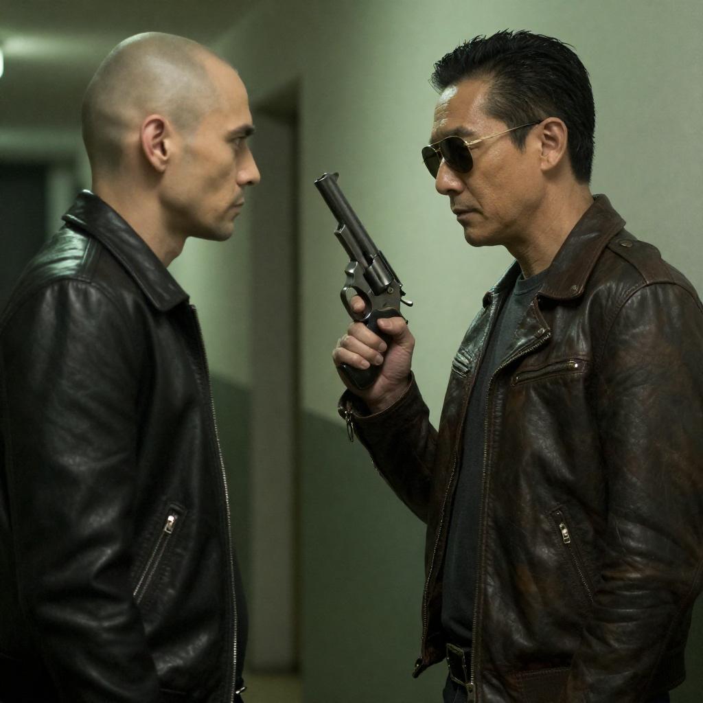 Photograph of a man in a gray suit, black shirt, and sunglasses, holding a gun out of a truck window. Another man in a cowboy hat sits in the truck. Desert background. Man in suit has slicked-back hair and intense expression. Truck is yellow with a red emblem.