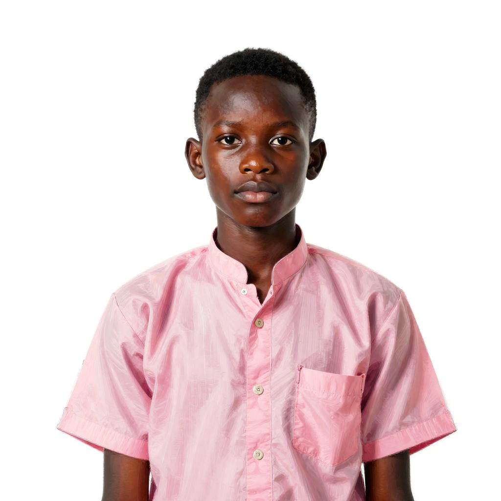 Studio portrait of a young black male with short black hair wearing a traditional pink shirt with short sleeves and a stand-up collar, set against a clean white background. The subject has a solemn expression and faces forward in a simple, minimalistic setting.