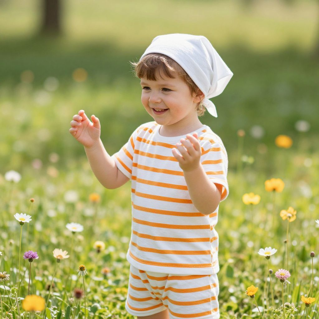 Photograph of a smiling toddler in orange and white striped outfit and white cap, standing in a sunlit, colorful meadow.