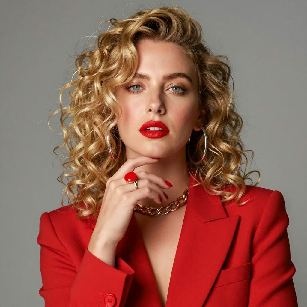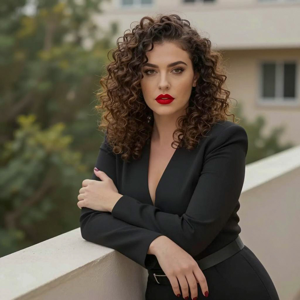 Portrait of a curly-haired woman with fair skin wearing a black outfit. She leans on a white ledge with arms crossed, featuring dark red nails and bold red lipstick. The background includes blurred greenery and a beige building, highlighting her serious expression.