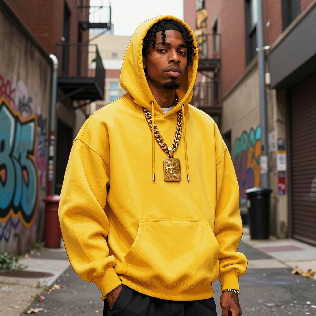 Hood custom boondocks character, urban streetwear style with oversized hoodie and gold chains, standing in a gritty city alleyway, graffiti walls, dynamic lighting, bold and expressive facial features, vibrant colors, comic book style illustration.