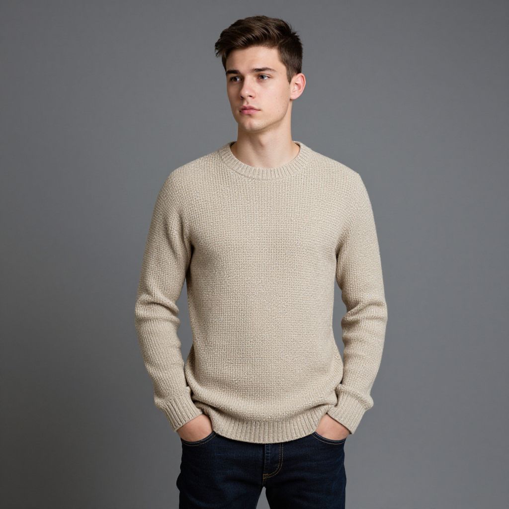 This is a photograph of a young man with short brown hair, standing against a plain gray background. He's wearing a beige, chunky-knit sweater with a round neck and dark blue jeans. His hands are casually tucked into his pockets, and he's looking slightly to the side with a neutral expression. The lighting is even, highlighting the textures of his sweater.