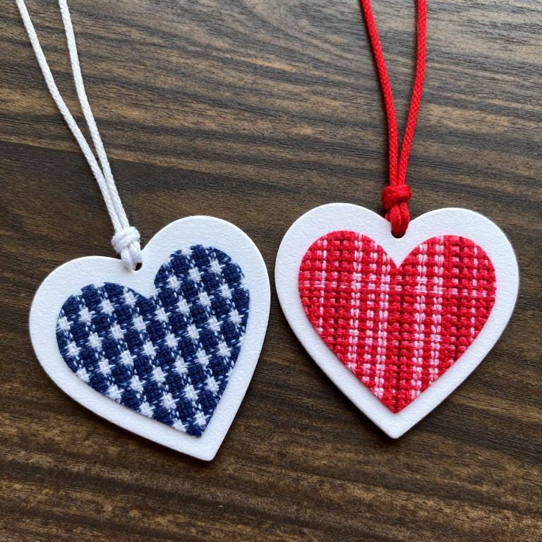 Two heart-shaped gift tags featuring Harris Tweed fabric inserts. One tag has a navy blue and white checkered pattern with a white string, the other has a red and white checkered pattern with a red string. Both tags have white borders and are placed on a wooden surface.