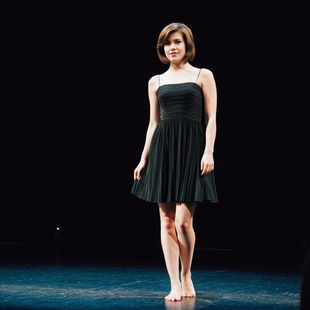 A young woman with short brown hair and bare shoulders stands barefoot on a dimly lit stage. She is wearing a sleeveless, pleated black dress with thin straps, posing confidently against a dark background.