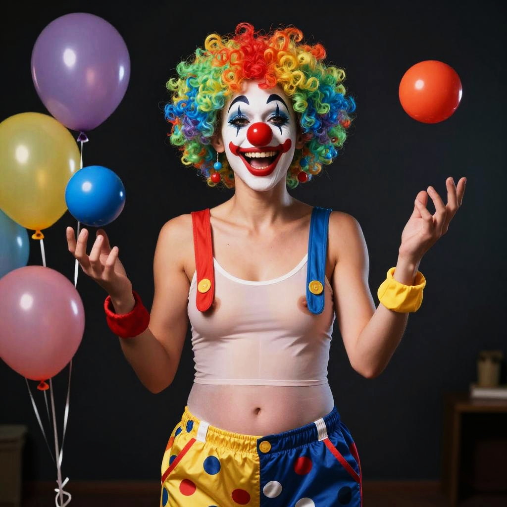 (photorealistic:1.4), official art, unity 8k wallpaper, ultra detailed, beautiful and aesthetic, masterpiece, best quality, solo, clown, rainbow wig, red nose, overalls, polka dots, balloons, juggling balls, laughter, (nsfw:0.9), see-through|areola slip|nipple_slip, belly, hips, dramatic, deep shadow, low key