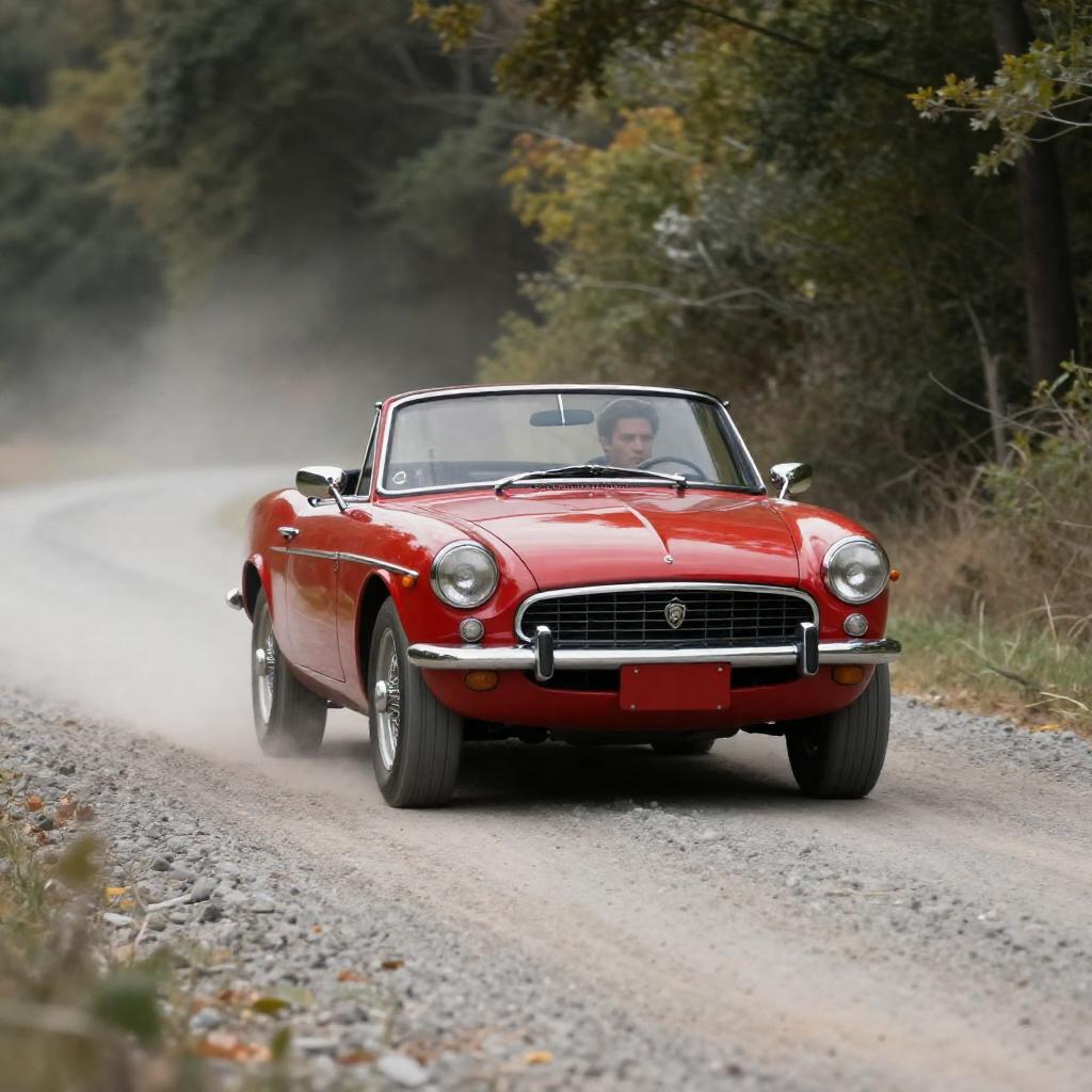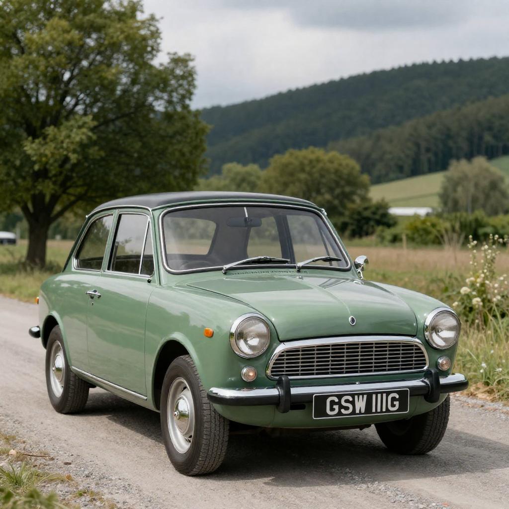 Photograph of a green vintage car with a black roof and chrome accents, parked on a gravel road. The car has round headlights and a black front bumper with the license plate "GSW 111G." Background features lush green trees and a forested hill under a partly cloudy sky.