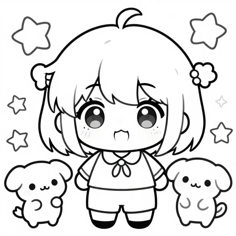 Chibi kawaii anime coloring pages featuring adorable tiny characters with oversized expressive eyes, cute animal companions, and playful backgrounds, rendered in clean line art style perfect for vibrant color filling and creative designs.