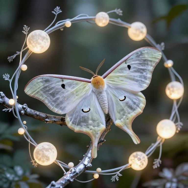 Lunar moth fairy resting on a silver branch encircled by glowing moon orbs and delicate vines, wings resembling lunar moth with fine details and soft glow, enchanted woodland clearing illuminated by soft moonlight, dreamy and surreal ambiance.