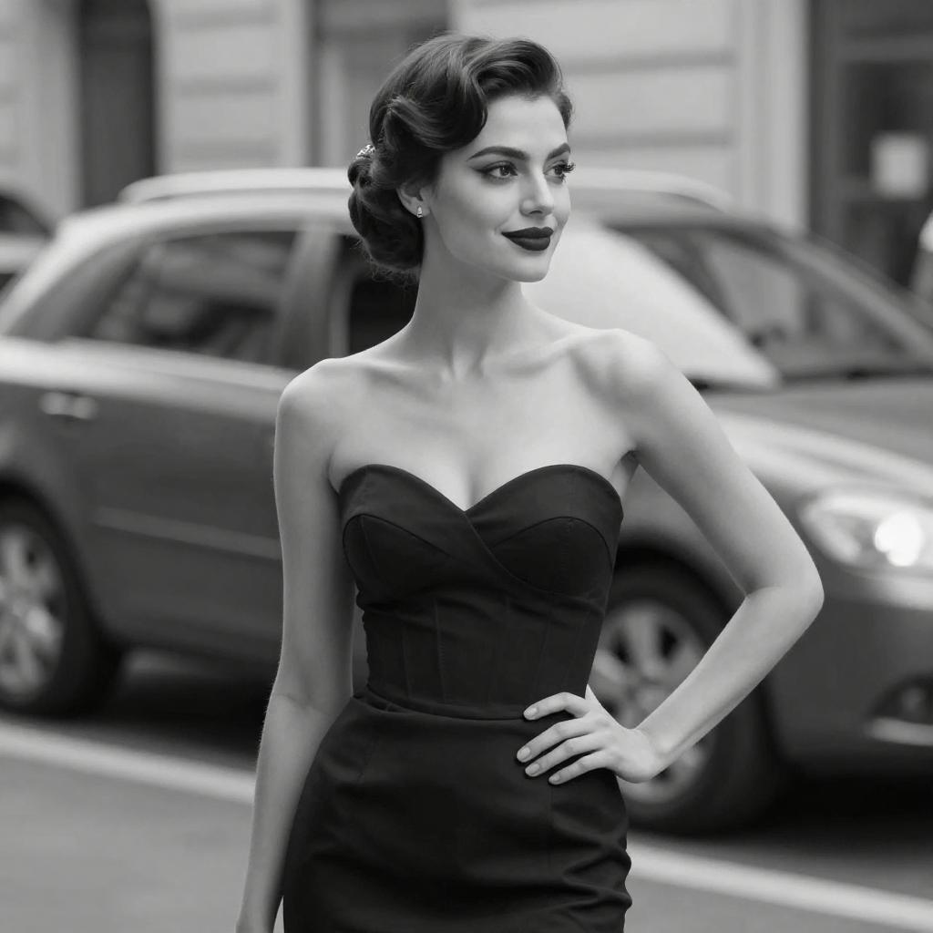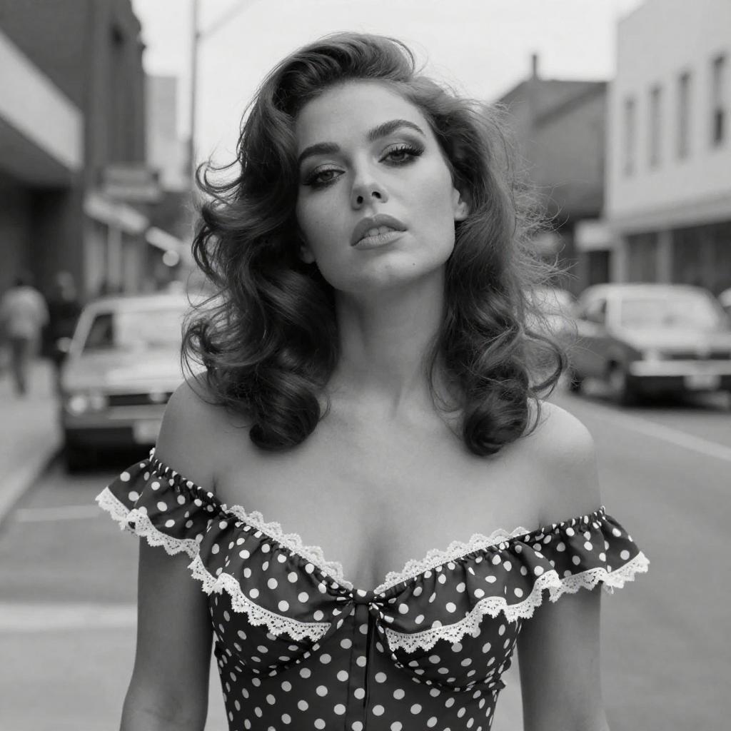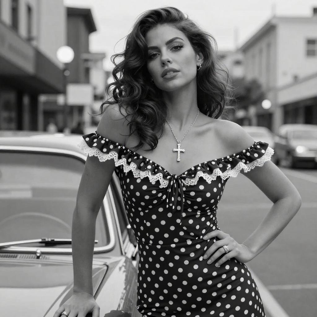 Black and white photo of a confident woman with wavy dark hair, wearing a polka dot dress with off-the-shoulder ruffled lace trim. She's leaning against a car with one hand on her hip, exuding a sultry vibe. Background shows an urban street with blurred buildings and streetlights. She's wearing a cross necklace and has a ring on her right hand. The overall vibe is retro chic.