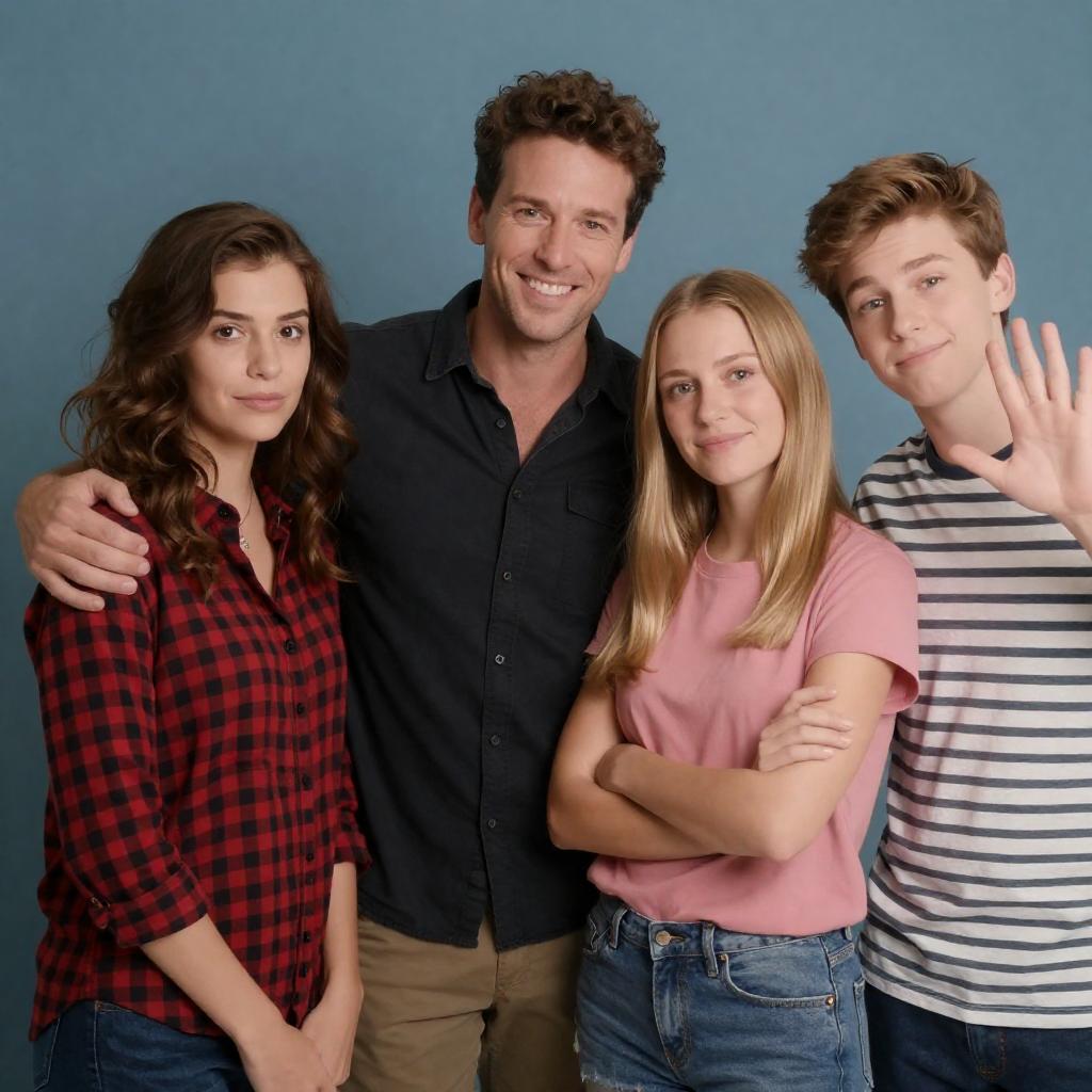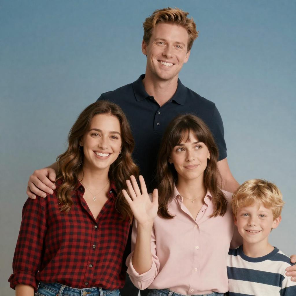 Photograph of four people against a blue gradient background. Man in dark polo shirt, smiling, stands behind two women and a boy. Woman on left wears red checkered shirt, smiling, with wavy brown hair. Woman on right wears pink shirt, looking to the side, waving with right hand. Boy on far right, blond, smiling, wears striped shirt. Man's arms around women's shoulders.
