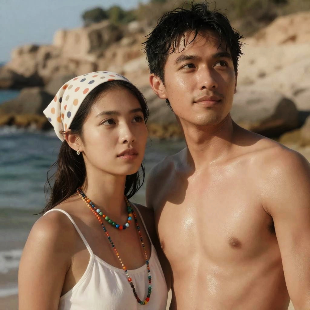 Photograph of a shirtless man and woman standing close together. The woman wears a polka-dotted headscarf, colorful bead necklace, and white top. The man has short dark hair, wet skin, and a slight smile. Rocky coastline background. Both look slightly upward. Sunlight highlights their faces. Man's left arm slightly visible.