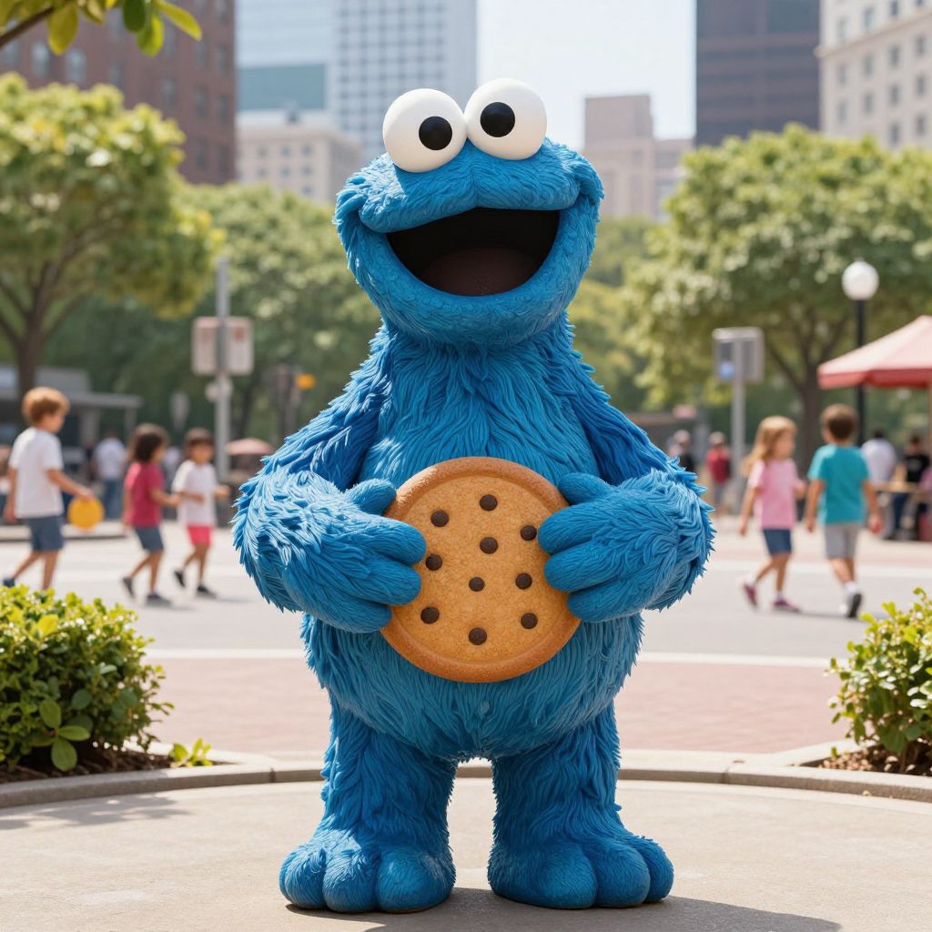Cookie Monster statue standing in a vibrant urban park, detailed blue fur texture, playful eyes, giant cookies clutched in hands, sunny day with children playing around, photorealistic style with bright and cheerful colors