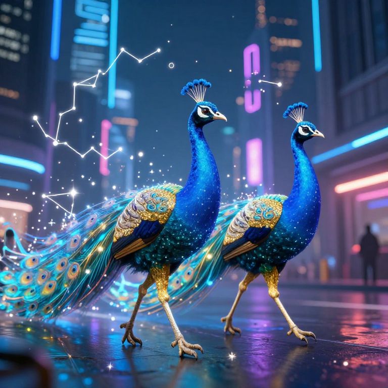 In a cyberpunk-inspired digital art rendering, two ethereal peacocks composed of vibrant blue and golden hues, adorned with sparkling starlight, stride confidently through a neon-lit urban landscape, leaving behind trails of luminous constellations that dance across the reflective pavement.