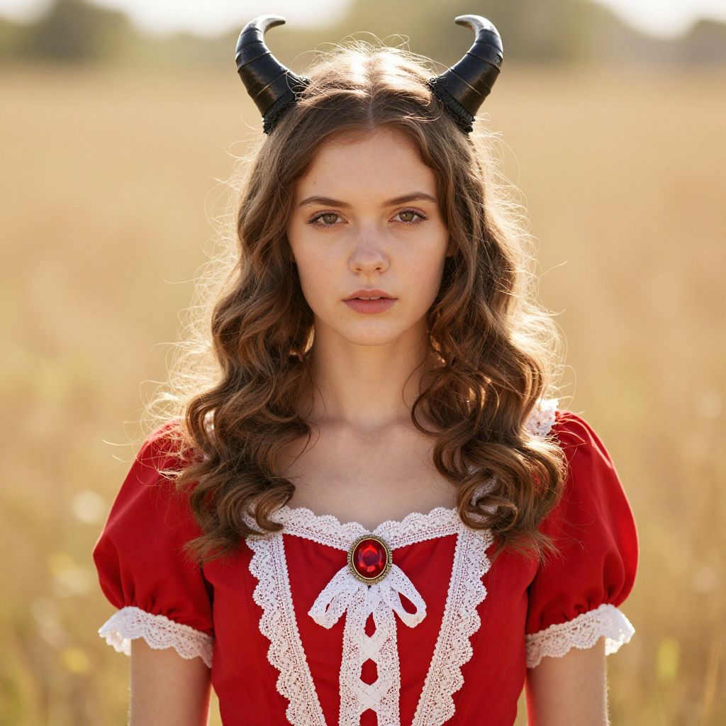 Young woman with wavy brown hair, wearing red lace dress and black devil horns, stands in sunlit golden field. Photograph.