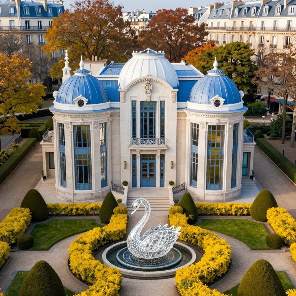 Art Deco mansion located in Paris historic district featuring multi-level design and large crystal swan sculpture in the garden. Surrounded by neatly trimmed yellow bushes and trees in autumn colors. The mansion boasts white and blue domed roofs with reflective glass windows. Soft morning light highlights the architectural details and landscaped yard captured from a drone perspective.