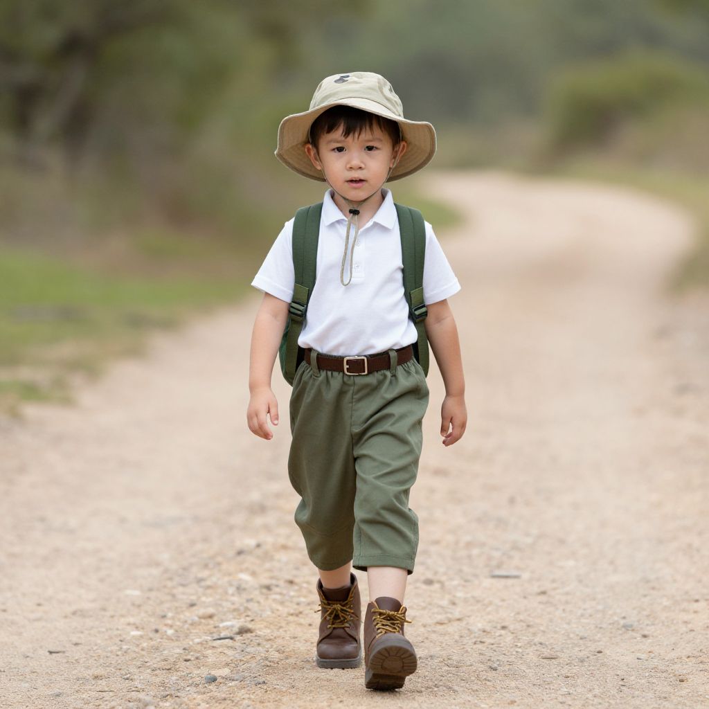 Photograph of a young Asian boy with fair skin and black hair, wearing a wide-brimmed beige hat, white short-sleeve shirt, green suspenders, and matching green knee-length pants. He has brown lace-up boots and a brown belt. The boy is walking confidently down a gravel path, slightly blurred greenery and trees in the background. He carries a small black backpack and looks directly at the camera with a neutral expression. The path is narrow and extends into the distance, giving a sense of depth and openness. The lighting is natural, with a soft, diffused light.